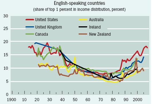 We are fortunate that the most powerful countries subsequent to the Second World War are, by historic standards, inclusive and democratic. As shown in the graphic, income inequality trended lower in English-speaking countries after the war until the 1980s. However, inequality has since increased, possibly corresponding to the rise of trade globalization and the deindustrialization of many western countries, directing income away from the bulk of workers and toward the elite.